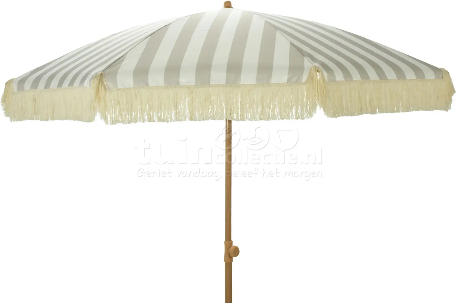 Hoe sfeervol is deze strandparasol met streepdesign? Het streepdesign is in de kleuren taupe en wit! Daarbij heeft de parasol een metalen stok met bruine houtlook uitstraling en is het doek voorzien van speelse franjes die bewegen door de wind. De stokparasol heeft een diameter van 200cm en is kantelbaar, waardoor hij de zon goed blokkeert. Tevens is de stok inschuifbaar, wat het opbergen en vervoeren in de bijleverde parasolzak eenvoudig maakt. Zo kun je hem gemakkelijk mee nemen tijdens een dagje naar het strand of op de camping.