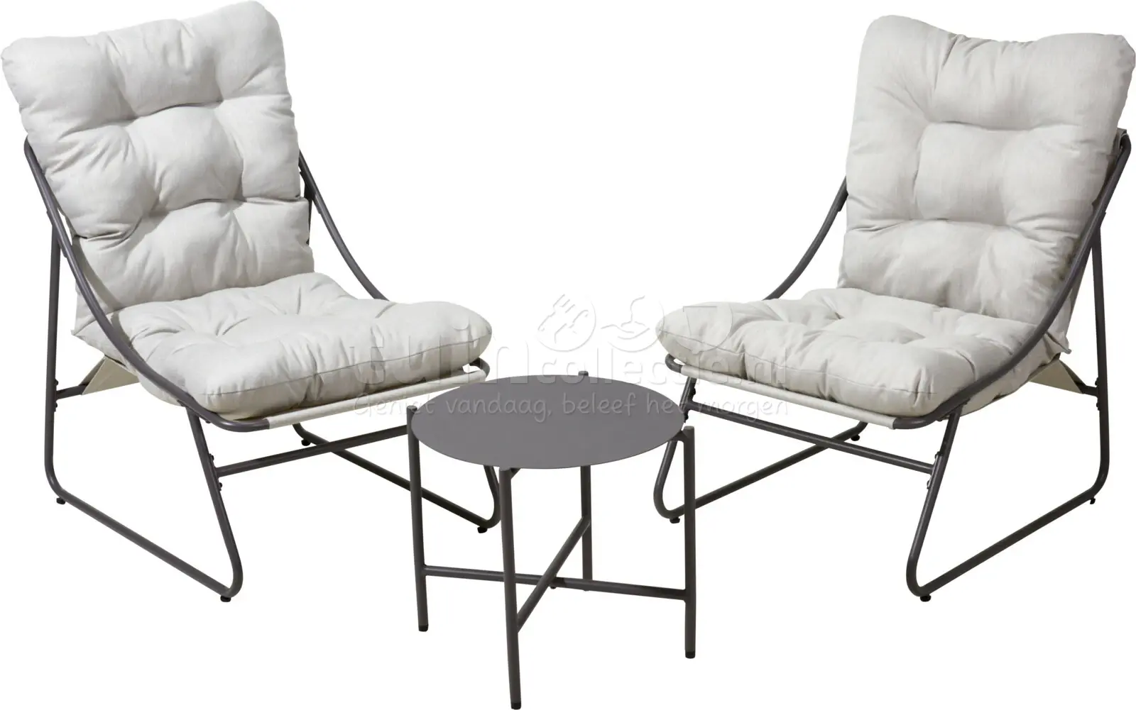 Met deze ProGarden loungestoel set geniet je volop van het mooie weer op het terras of balkon! Dit compacte tuinsetje bestaat uit twee loungestoelen en een rond tafeltje van 45cm doorsnede. Het slanke, maar stevige stalen frame is donkergrijs-antraciet van kleur en eenvoudig in elkaar te zetten. De zitting is gemaakt van textileen, dat net als een klassieke strandstoelzitting tussen het frame hangt. Hierdoor beweegt de zitting iets mee en zorgt het voor extra comfort. Ook wordt de loungestoel set geleverd inclusief dikke comfortabele kussens. Deze lichtgrijze kussens zijn gemaakt van polyester. De poten zijn voorzien van beschermdopjes, waardoor de ondergrond niet beschadigd raakt.