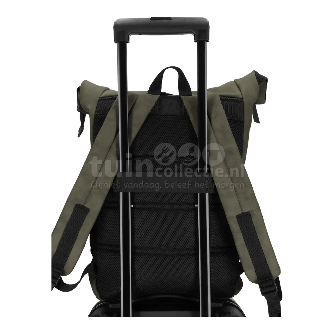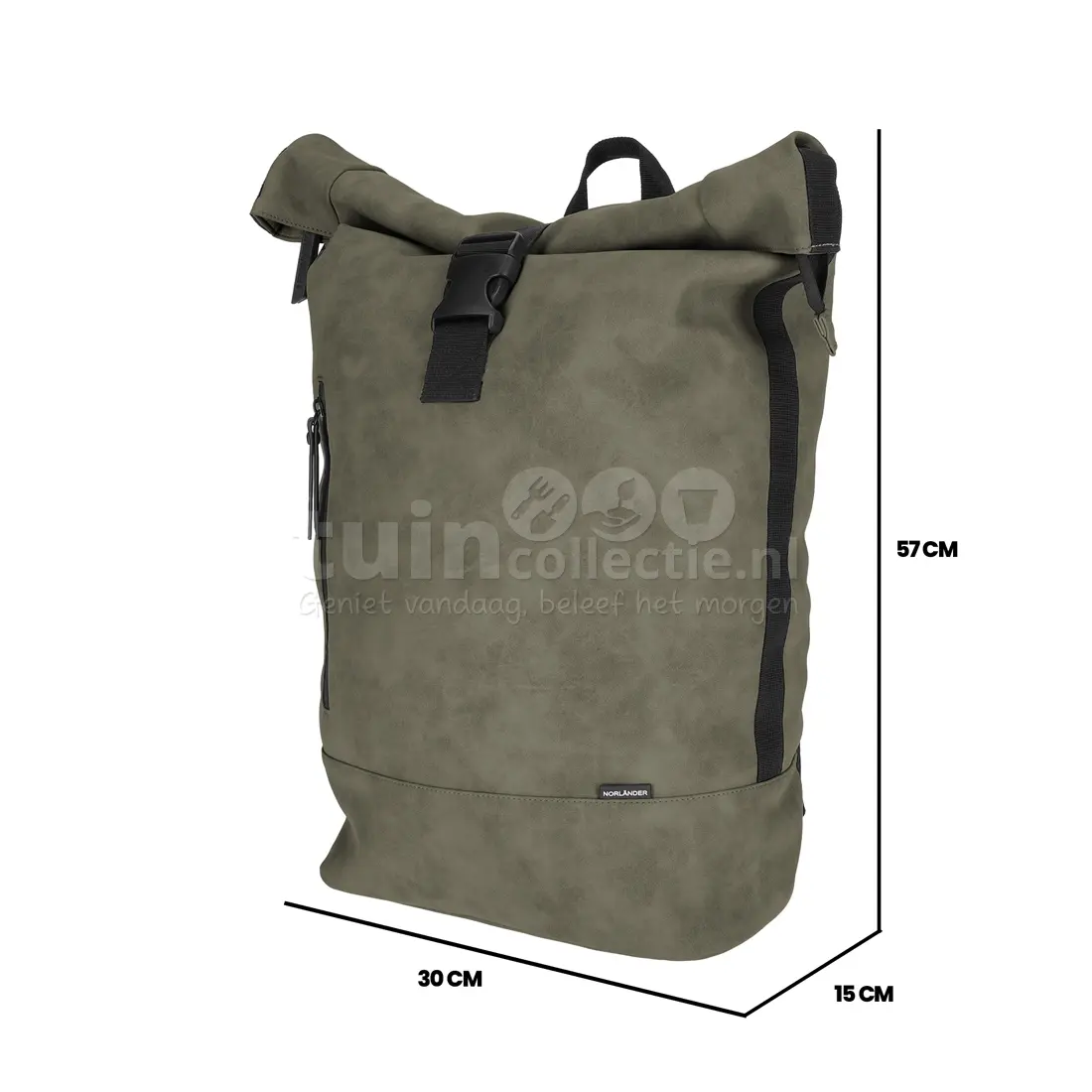 De NORLÄNDER Nubuck Rol rugzak is de ideale tas om mee te nemen bij een lange wandeling, een reis of naar het werk. Aan de binnenzijde beschikt hij namelijk over een laptop divider en extra opbergvakje. De rugzak is gemaakt van vegan leer in de kleur groen. Hij is geschikt voor ieder weertype door de gecoate ritssluiting en het waterafstotende vegan leer. De bovenzijde van de Nubuck Rol tas is eenvoudig op te rollen en vast te zetten met de zwarte band en gesp. Verder heeft hij een afsluitbaar opbergvak aan de voorzijde en aan de achterzijde een trolleyband waarmee hij over een trolleystang te plaatsen is. De rugzijde en verstelbare schouderbanden zijn voorzien van een foam voering, waardoor hij een fijn draagcomfort heeft. Deze stoere NORLÄNDER Nubuck Rol rugtas is een echte must-have!