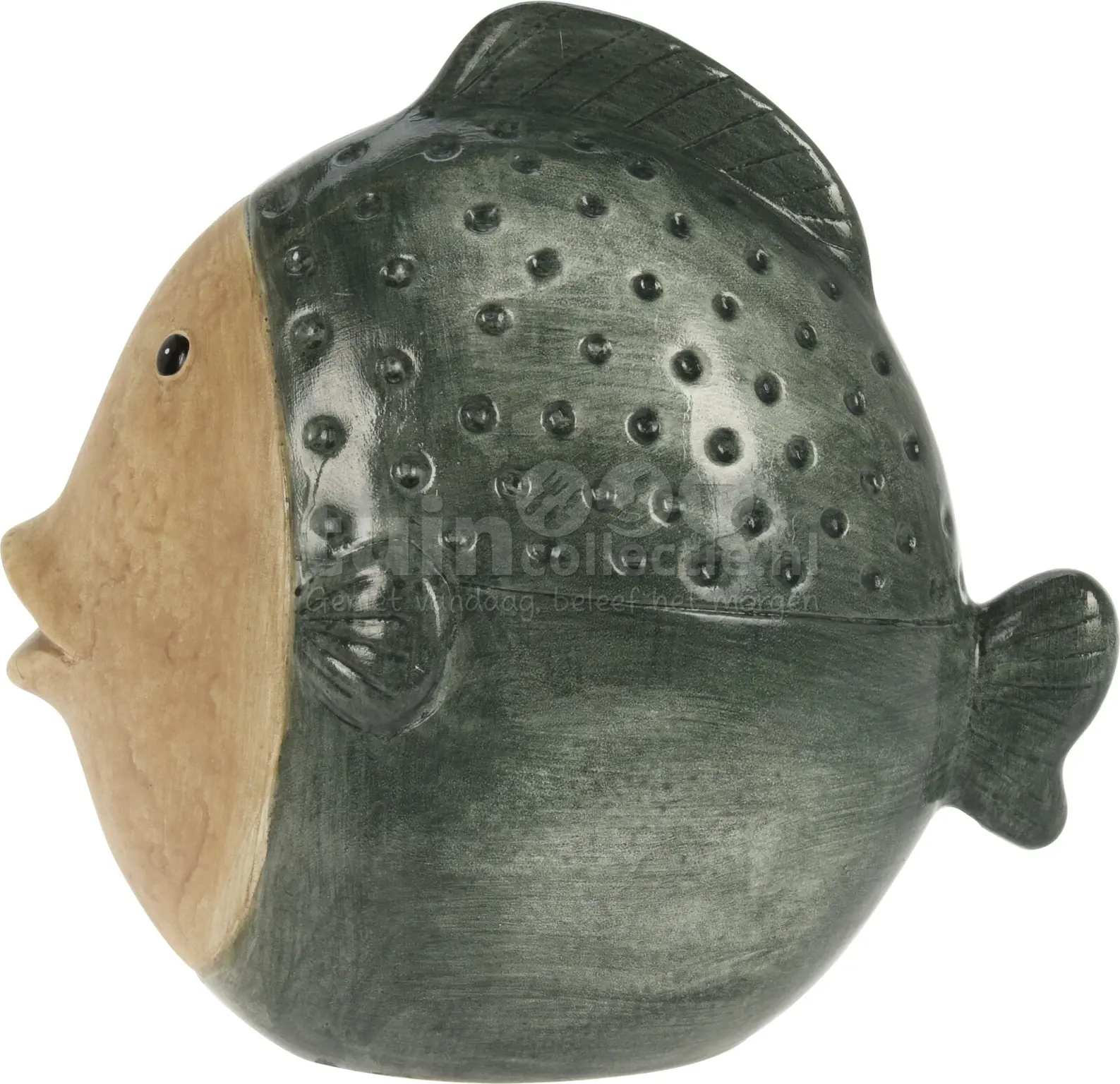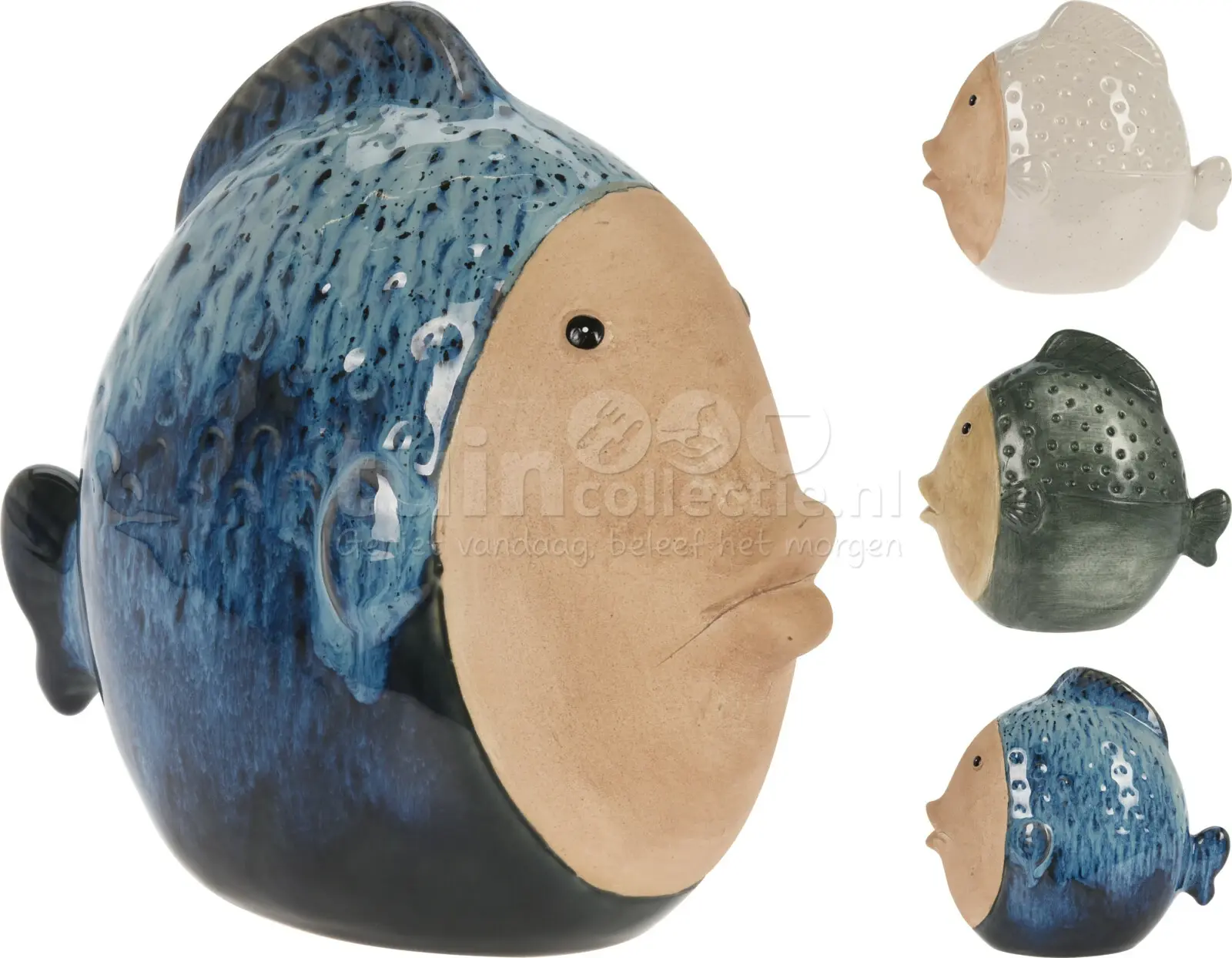 Dit vissen beeld, gemaakt van porselein, brengt een vrolijke sfeer in huis. Het beeldje is afgewerkt met een glanzende glazuurlaag en is er in drie kleuren; blauw, groen en wit*. Daarbij heeft de glazuurlaag een mooi kleurverloop. De vis is 20x11x19cm groot.