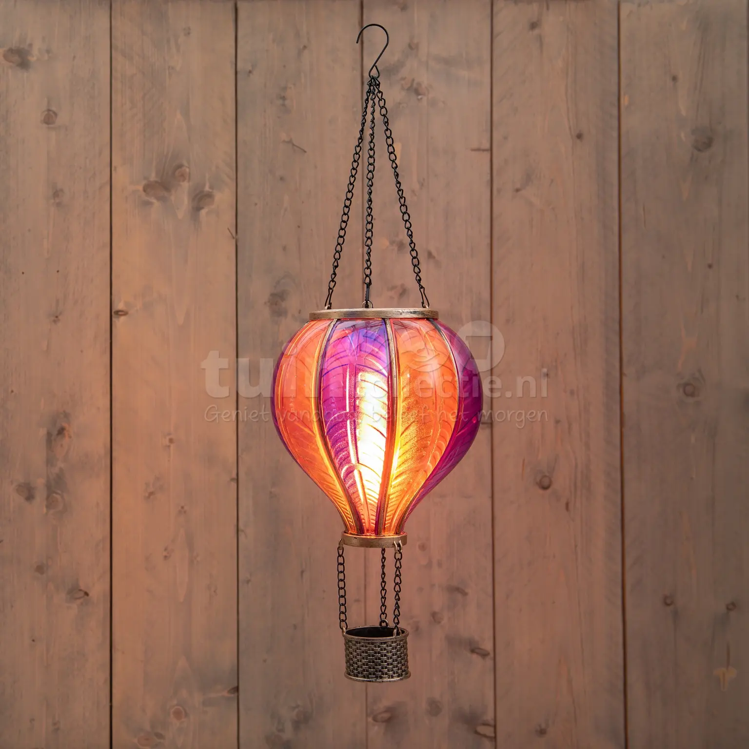 Breng eenvoudig sfeer in de tuin met deze solar hanglamp in de vorm van een luchtballon! De Anna's Collection luchtballon hanglamp voor buiten is gemaakt van kunststof en heeft een lengte van 62cm en een diameter van 20cm. Hij is voorzien van 24 LED lampjes met warm wit licht én vlameffect en werkt volledig op zonne-energie. Hierdoor kun je hem op diverse plekken in de tuin ophangen, zonder dat er een stroompunt in de buurt moet zijn. Deze solar luchtballon tuinlamp heeft een kunststof ballon in de kleuren oranje en roze. Hang hem eenvoudig middels de ketting en het haakje op en geniet in de avonduren van de sfeerverlichting.