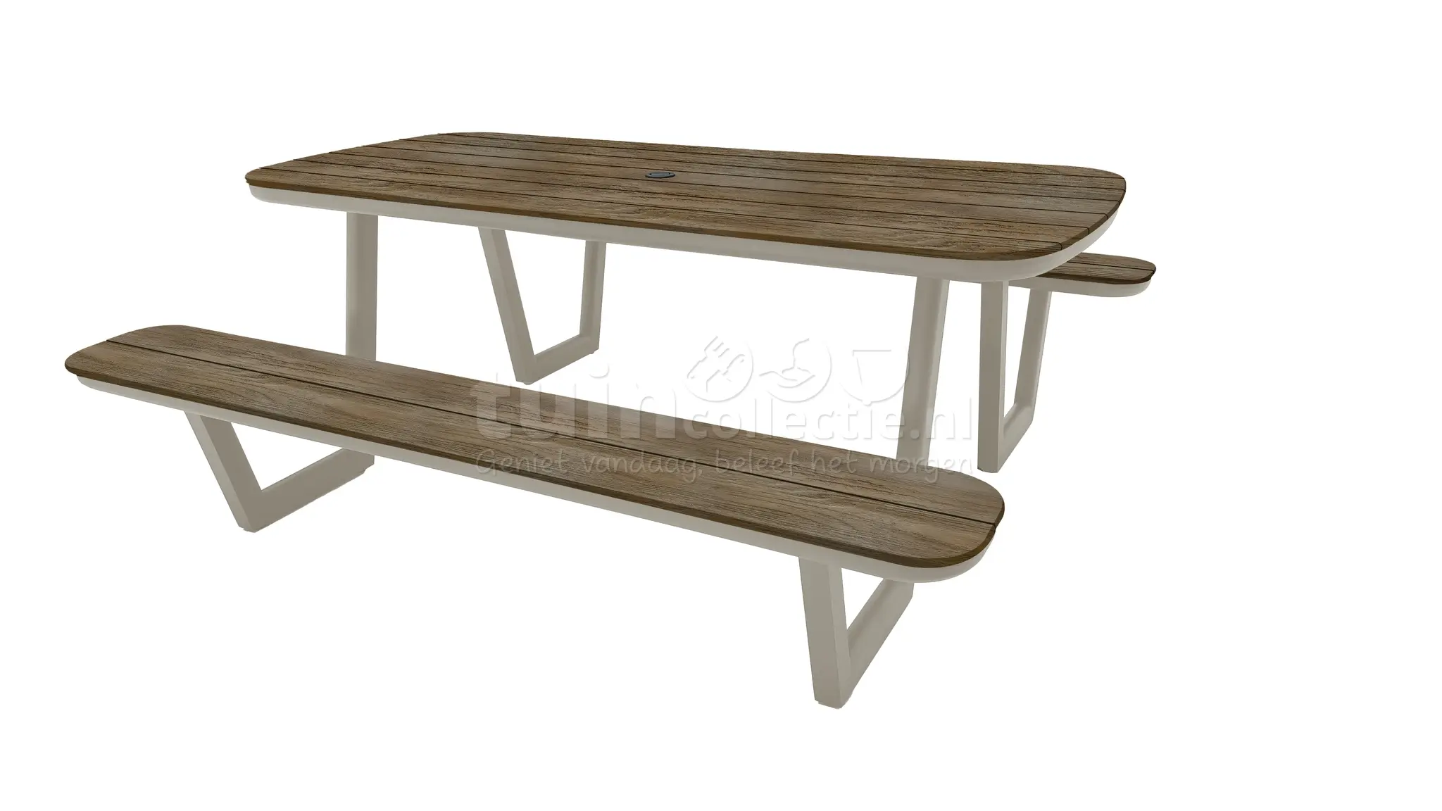 Geniet heerlijk in de tuin tijdens een barbecue, spelletjesavond of lunch op de SenS-Line Picknickbank Lazio! Deze picknickbank heeft een moderne vormgeving en bestaat uit een taupekleurig aluminium frame. De zittingen en het tafelblad zijn bruin van kleur met een houtlook, maar zijn gemaakt van weerbestendig polywood. Daarbij zijn de hoeken rond afgewerkt, wat zorgt voor de moderne en vriendelijke uitstraling. Tevens heeft de picknicktafel in het midden van het blad een parasolopening. Hierdoor zet je eenvoudig een stokparasol op, waardoor hij in de schaduw kunt vertoeven op zonnige dagen. De Lazio picknickbank biedt met zijn lengte van 200cm plaats aan ca. 8 personen. De totale breedte van de picknickbank, inclusief zittingen, is 180cm.