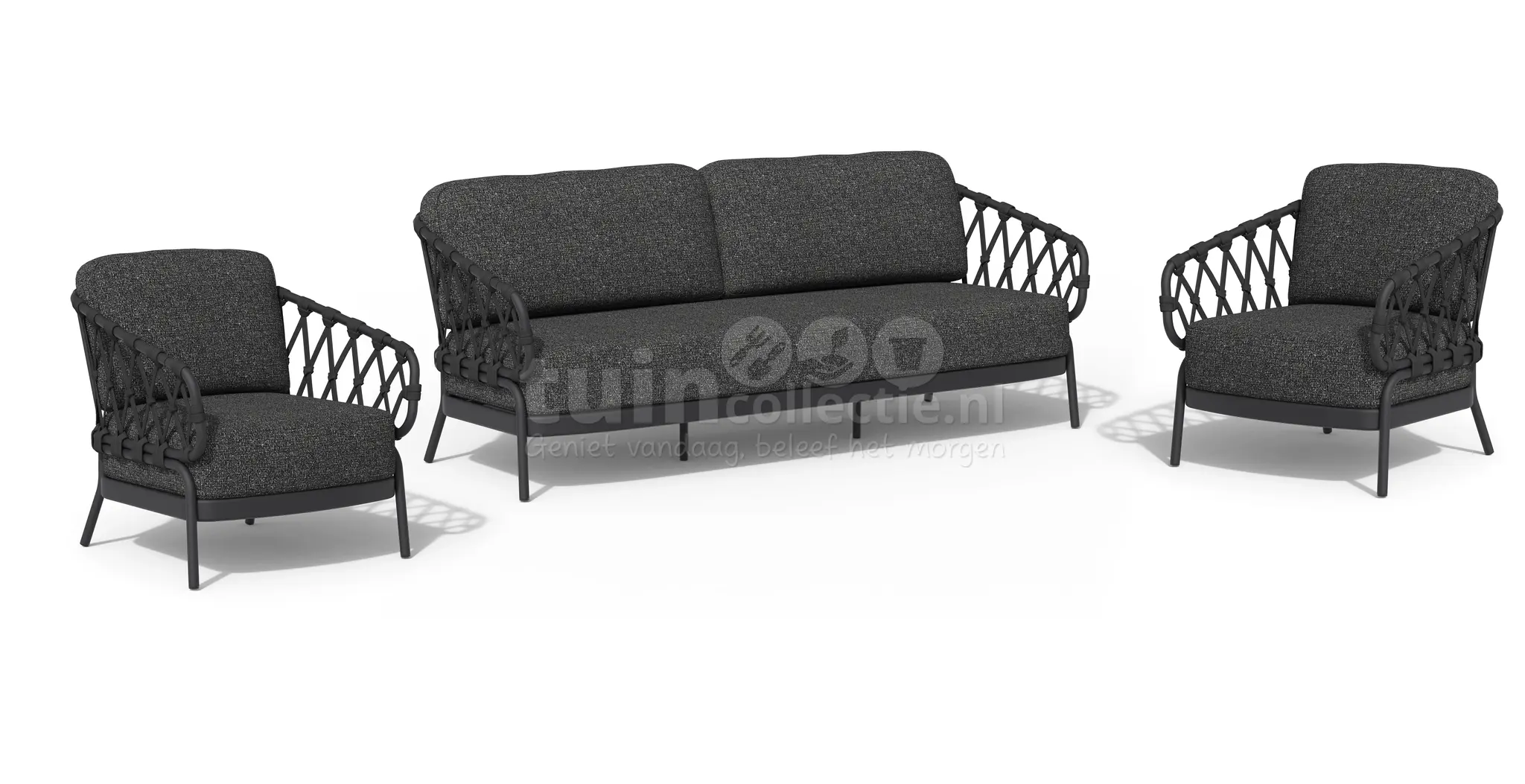 De Natal loungeset van Tierra Outdoor is een moderne en comfortabele tuinset! De loungeset bestaat uit 1 drie-zit loungebank, 2 loungestoelen en 1 Nora loungetafel. De stoelen en bank uit deze set zijn gemaakt van stevig aluminium in de kleur charcoal (antraciet-zwart) en bespannen met open rope-vlechtwerk. De stevige, maar comfortabele kussens hiervan zijn gemaakt van het hoogwaardige Swiss Fabric in de kleur stone grey. Verder bestaat de Nora loungetafel uit een aluminium frame met de kleur charcoal en heeft hij een tafelblad van het weerbestendige materiaal trespa, met de kleur grafiet. De loungetafel is 120x70x30cm groot.