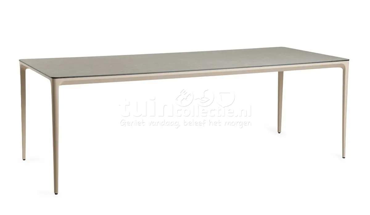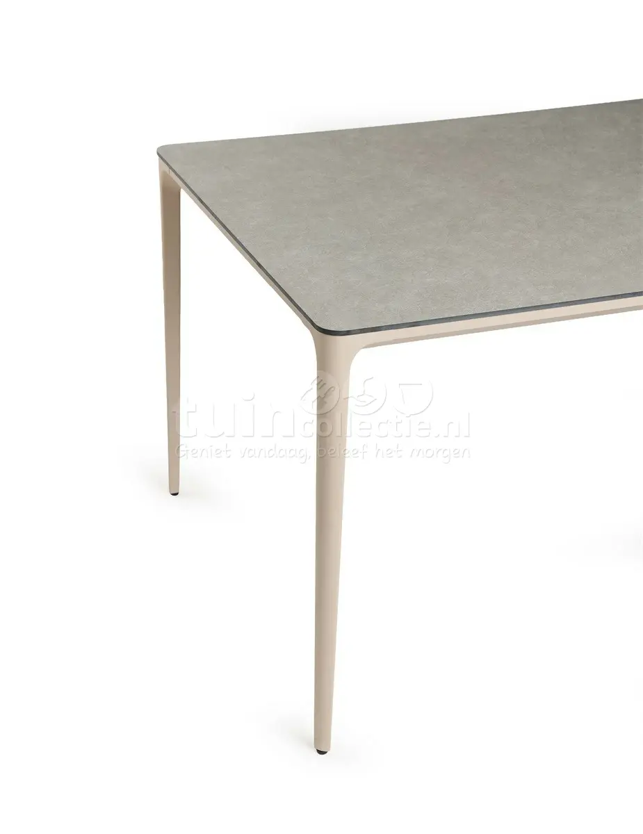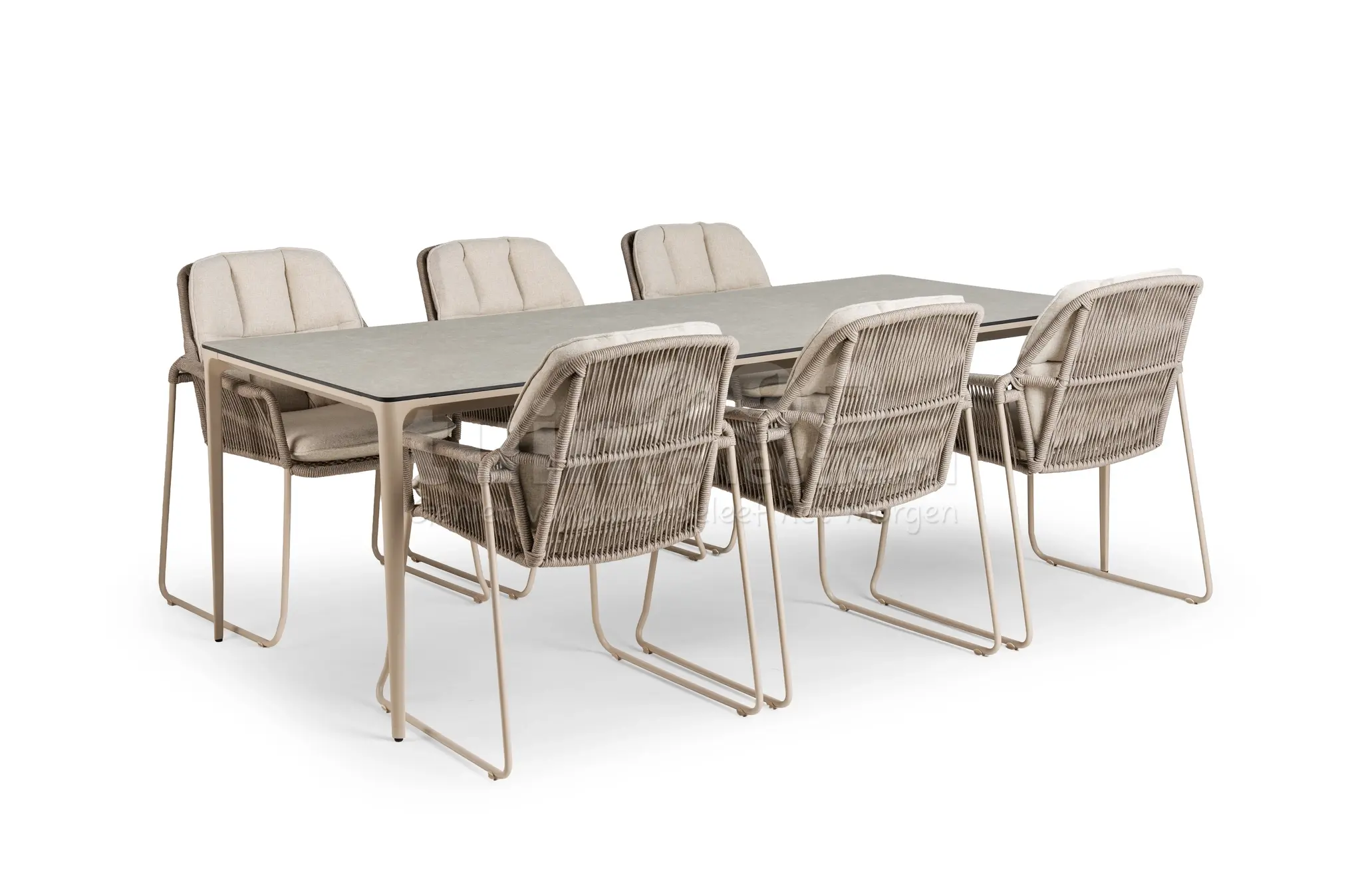Met tuinset Elegante Rivera geniet je comfortabel in de tuin tijdens een lunch, diner of spelletjesavond. Deze tuinset bestaat uit tuintafel Elegante en 6 Rivera tuinstoelen. De eettafel heeft een modern en elegant design en is gemaakt van een aluminium frame in de kleur champagne en een weerbestendig trespa tafelblad met de lichte stonelook Ophira kleur. De Rivera dining tuinstoel bestaat eveneens uit een champagnekleurig aluminium frame en is voorzien van weerbestendige Swiss Fabric kussens in de kleur navajo wit. Het frame is bespannen met een weerbestendig rope in dezelfde kleurtint en geeft de stoel een luxe uistraling. De dining tuintafel heeft een afmeting van 220x100cm. Het grote voordeel van diningstoel Rivera is dat hij stapelbaar is. Houd jij van comfort en een moderne, luxe uitstraling op het terras? Kies dan voor deze grote diningset!