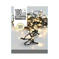 Sfeervolle kerstverlichting bestaande uit een groene draad van 13,5 meter met 180 LED lampjes in de kleur warm wit. De totale lengte van de snoer is 16,5 meter, inclusief adapter en 3 meter aanloopsnoer. Tussen elk lampje zit een afstand van 7,5cm. Dit lichtsnoer is, dankzij de IP44 trafo, geschikt voor binnen en buiten.