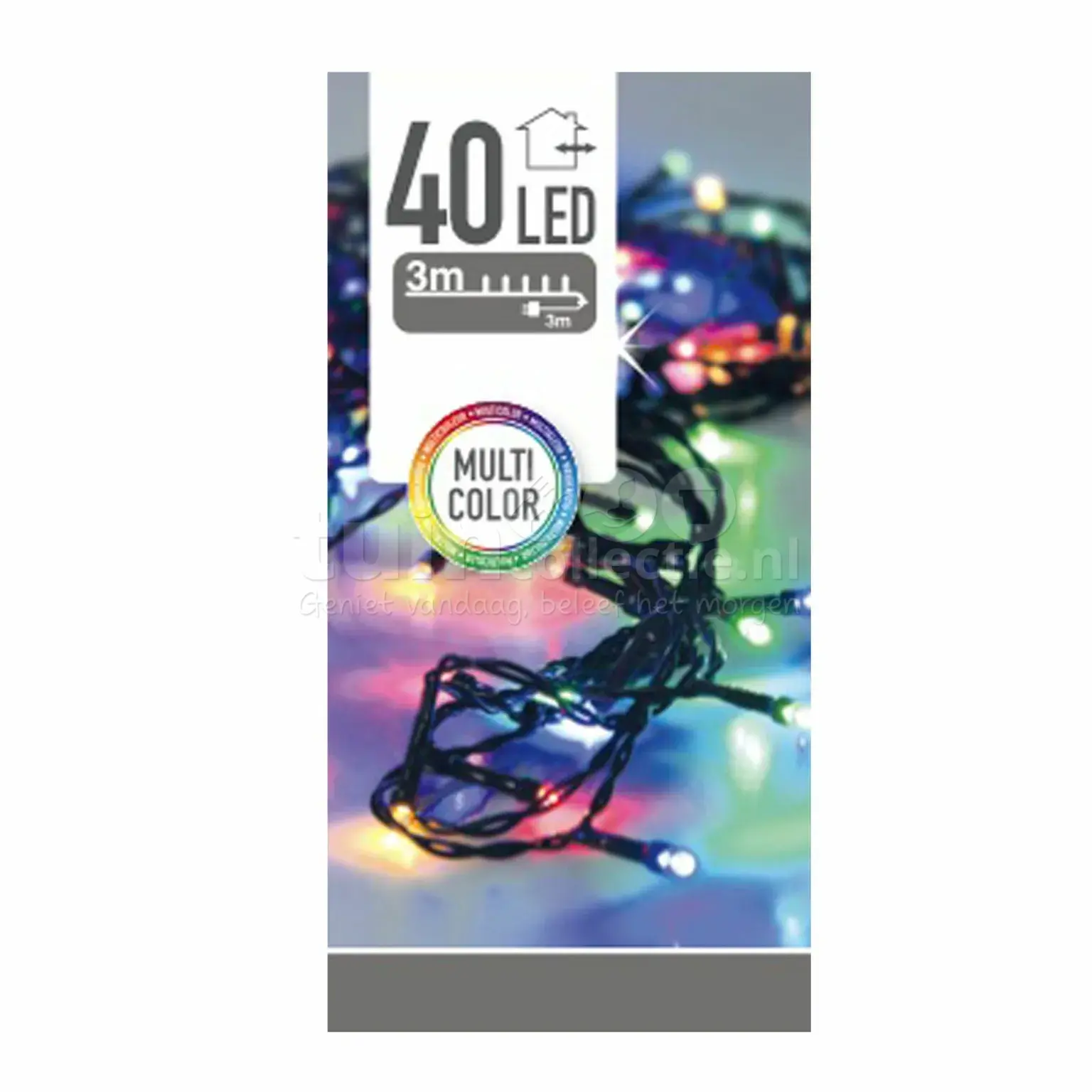 Tijdens de kerstperiode kunnen we helemaal los gaan met kerstlampjes! Hou jij van gekleurde lampjes? Dan mag deze kerstverlichting niet ontbreken. Deze verlichting bestaat uit een 3 meter lang groen snoer en is voorzien van 40 LED lampjes met multicolor (gekleurd) licht. De totale lengte van het snoer is 6 meter, inclusief 3 meter aanloopsnoer en adapter. Dankzij de IP44 adapter is deze kerstverlichting geschikt voor binnen- en buitenshuis.