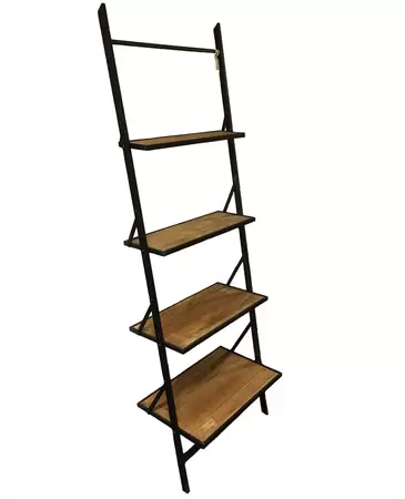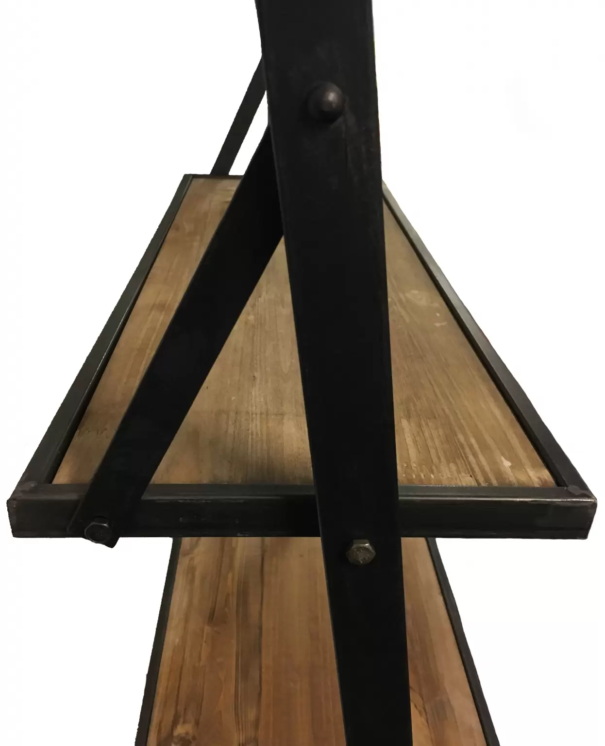Industrieel wandrek, gemaakt van metaal en hout. Het rek heeft vier houten planken met elk een andere afmeting. De planken hebben (van boven naar beneden) de volgende afmetingen: 61,5x15cm, 61,5x23cm, 61,5x32cm en 61,5x40cm. De totale hoogte van het rek is 197cm. Hij heeft een breedte van 65cm en een diepte 40cm. Plaats hem met het schuin afgeslepen frame tegen de wand en hij biedt een stevig geheel. Dit metalen rek past perfect in een industrieel interieur!