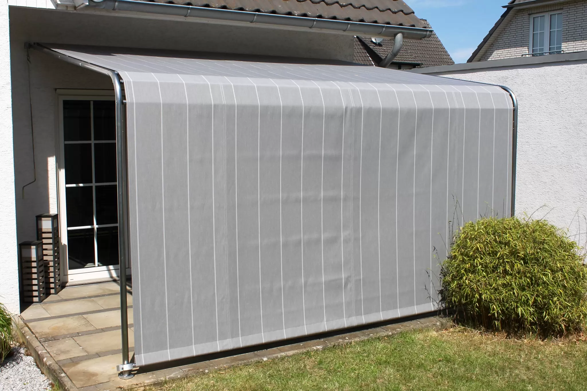 Deze terrasoverkapping bestaat uit een gecoat, stalen frame in de kleur antraciet en een polyester doek. Het 100% polyester doek, van ca. 260 gram per m2, is grijs van kleur met daarin subtiele witte strepen verwerkt. Het frame dient stevig aan de ondergrond bevestigd te worden door middel van de bijgeleverde voetplaten. Download hier de montagehandleiding.