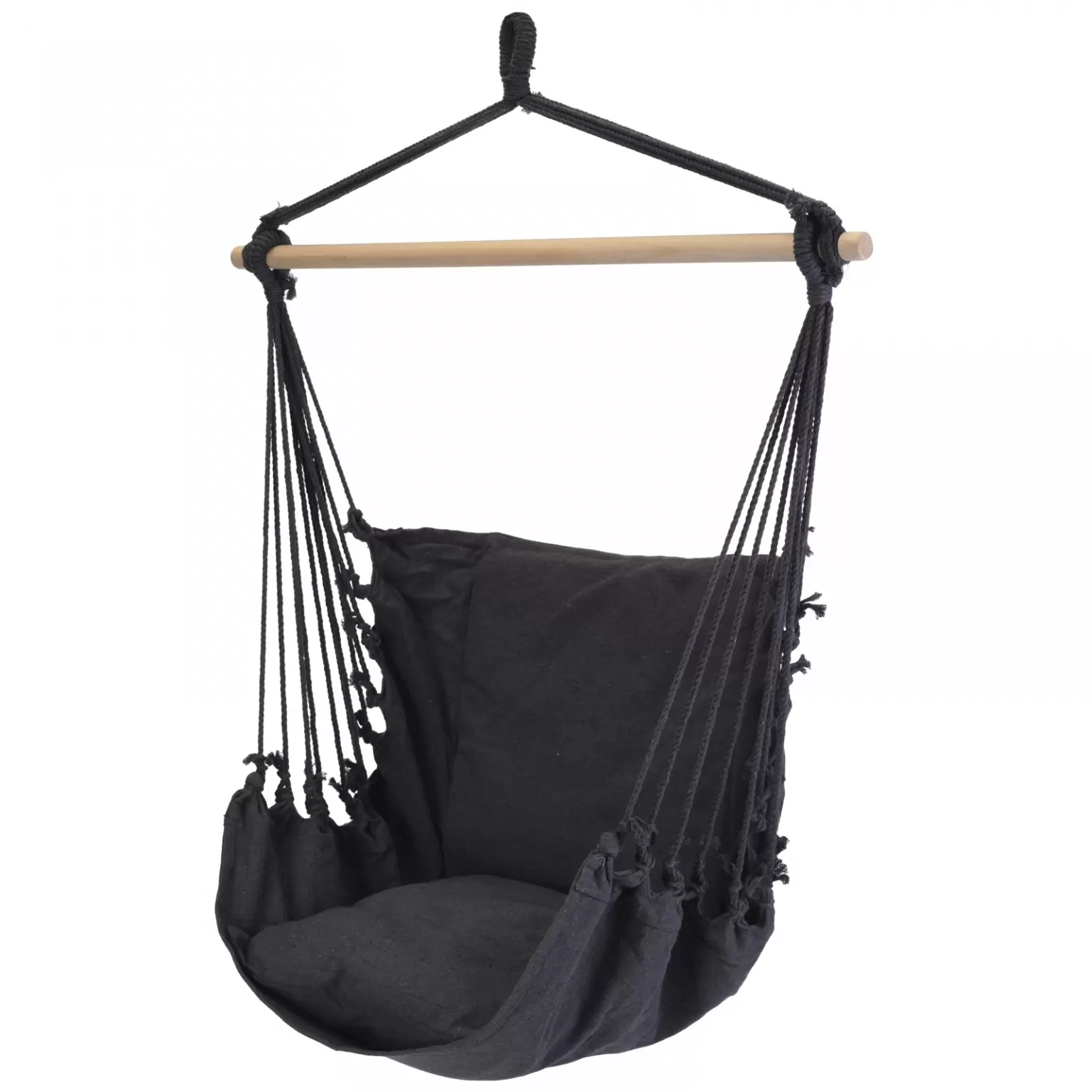 Op zoek naar een leuke hangstoel voor in huis of de tuin? Kies dan voor deze hangstoel, inclusief comfortabele kussens! Deze hangstoel bestaat voor 60% uit katoen en 40% uit polyester. Hij heeft een zitvlak van 45x45cm. De horizontale stok, waar de stoel aan vast hangt, heeft een lengte van 90cm. Aan de bovenzijde zit een grote lus, waarmee hij eenvoudig aan een stevige haak te bevestigen is. Het maximale draagvermogen is ca. 120kg.