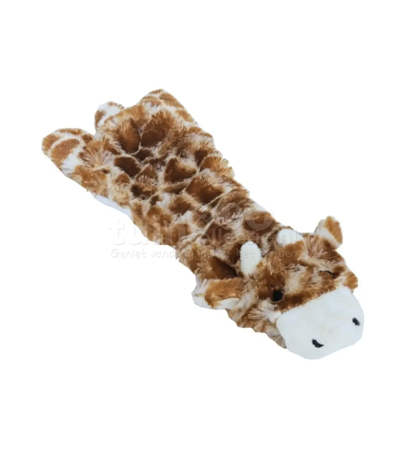 Geef je huisdier het perfecte knuffelmaatje! Deze giraffe is gemaakt van zacht pluche. Door zijn lengte van 35cm is deze platte knuffel geschikt voor kleinere honden. Het speeltje maakt een piepgeluid wanneer erop geknepen of gebeten wordt. Bovendien heeft het speelgoed geen losse onderdelen aan de buitenzijde, waardoor het extra veilig is voor jouw trouwe viervoeter. Deze pluche giraffe is perfect om mee te knuffelen en te spelen, maar let op: het is geen kauwspeeltje!