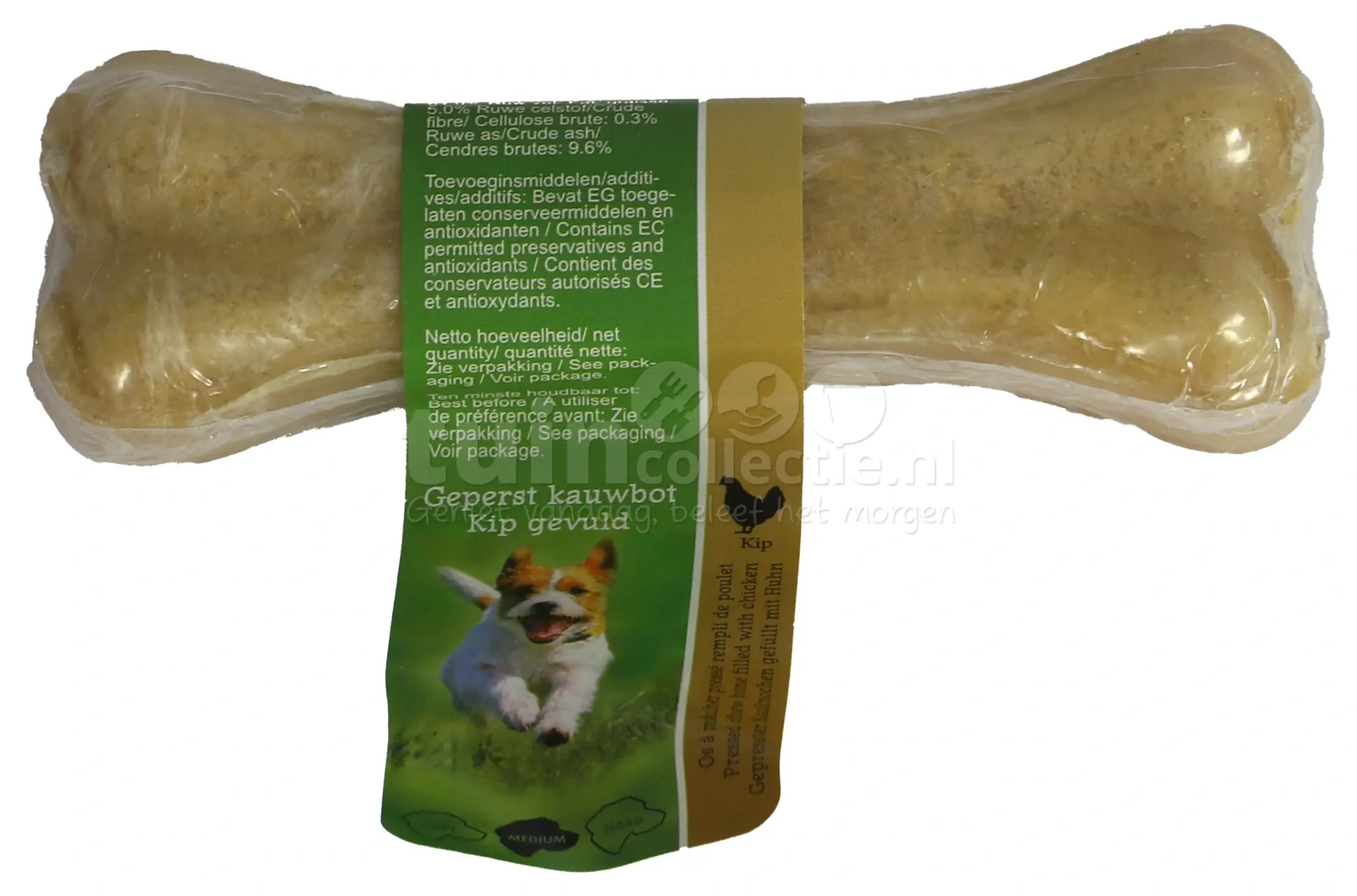 Dit geperste bot gevuld met kip is 100% natuurlijk en gemaakt van de beste kwaliteit buffelhuid. De kipvulling maakt dit bot onweerstaanbaar lekker en de buffelhuid aan de buitenkant zorgt voor extra lang kauwplezier. Daarnaast is deze 100% natuurlijke hondensnack ook nog eens goed voor het gebit van je trouwe viervoeter. Door te kauwen reinigt jouw hond op een natuurlijke manier het gebit en helpt het bij het versterken van de tanden. Deze honden kluif heeft een lengte van 13cm.